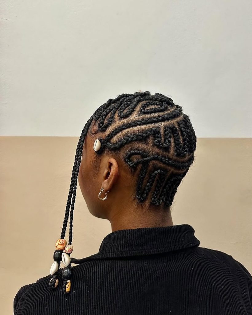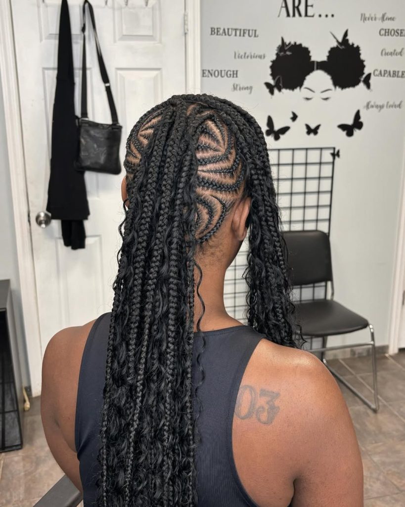 With the braids rounded off in a relaxed way, your style gets a big contrast. The way the hair is parted neatly, with the length curled, directs eyes to the scalp, where the eye-catching design is revealed. It’s effortlessly cool, like your favorite playlist on repeat.