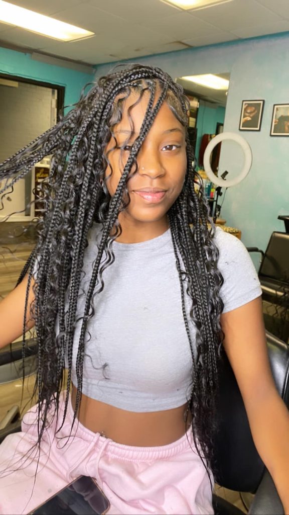 Golden hour, but make it hair. The warm and joyful look of these honey-toned braids shines with the playful spiral curls at the tips. It’s impossible not to feel happy when you come across this style. It radiates energy and positivity, like sunshine in motion.