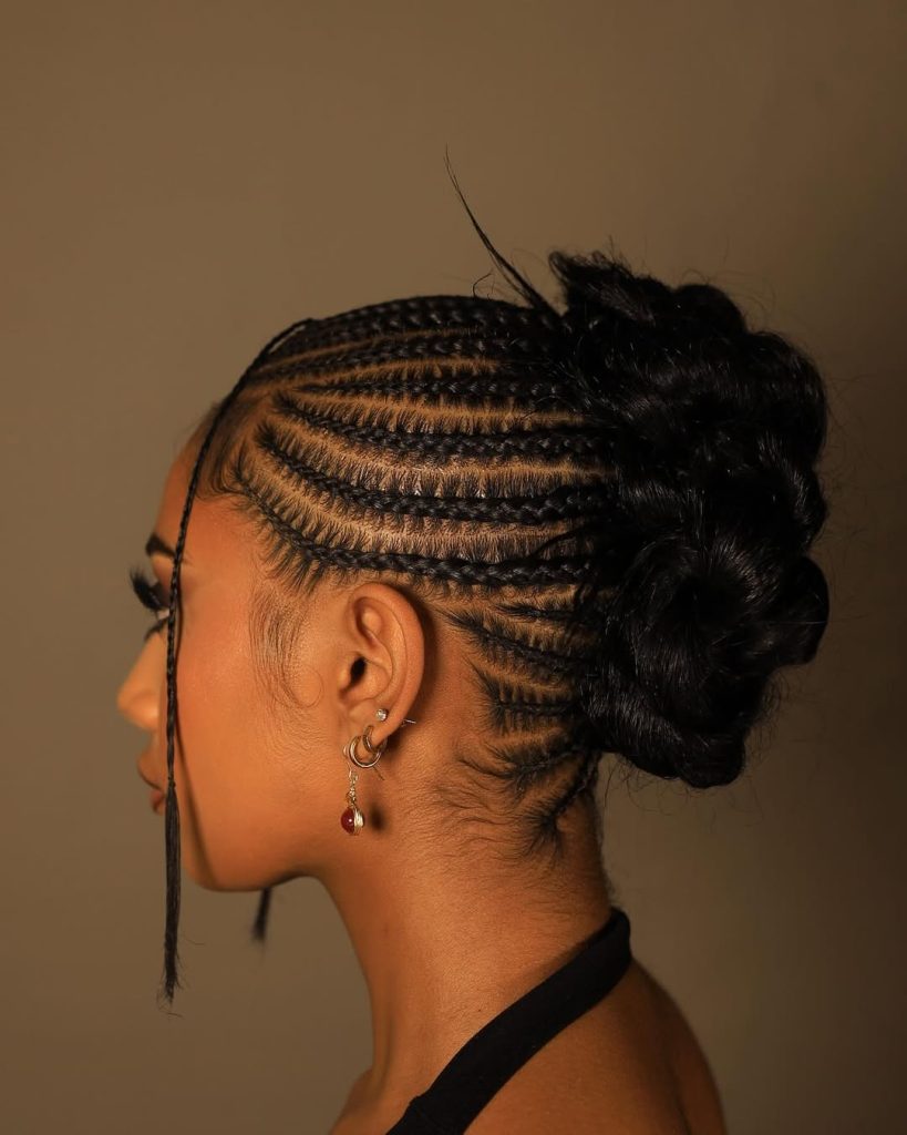 The braided low bun has a twist to it that makes it truly elegant. Fine art sculpting is how detailed cornrows look on her head and the bun shows off her coiled locks at the back. A one loose braid keeps your hairstyle slick and presentable all day.