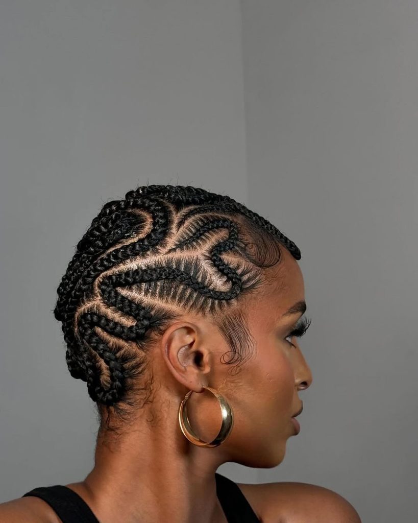 It’s a sculptural style, as the smooth lines of the cornrow pattern appear to be drawn on purposely. It’s refined and confident, with just a touch of fierceness. Throw on some gold hoops and look self-assured and you can walk into any room and stand out.