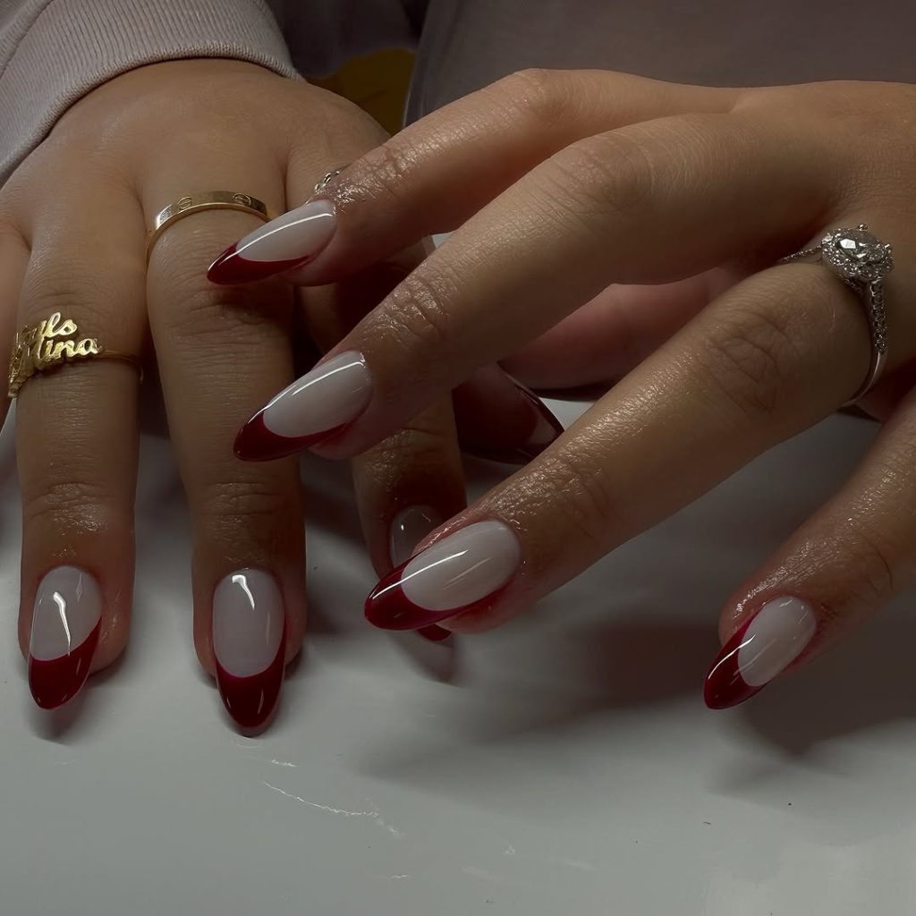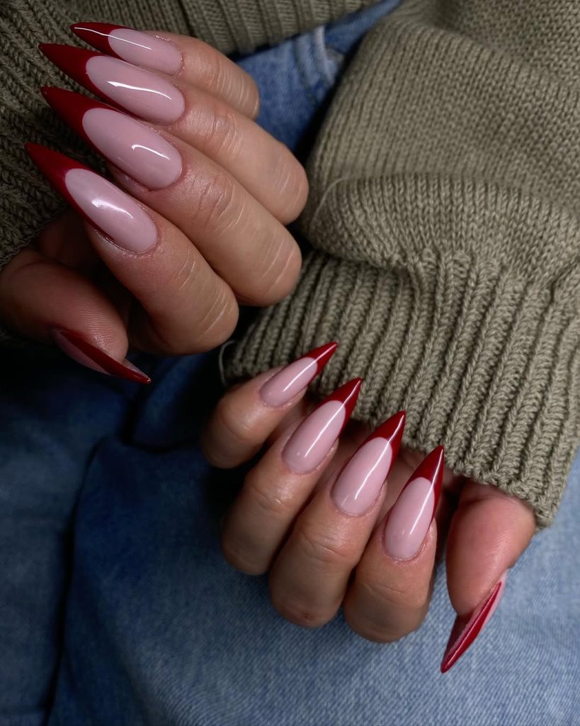 This is not just drama; it’s pure sensationalism. This elongated stiletto form is the one that you have to try if you are a fan of French nails. Its ultra-thin and inward curving edge that is burgundy shifts the traditional way of doing nails of the French. Despite the nude and neutral base, the stark red edges highlight the work. Available in 2025 for the audacious, the adventurous, and the stylers seeking ideas that break the limits of a French manicure.
