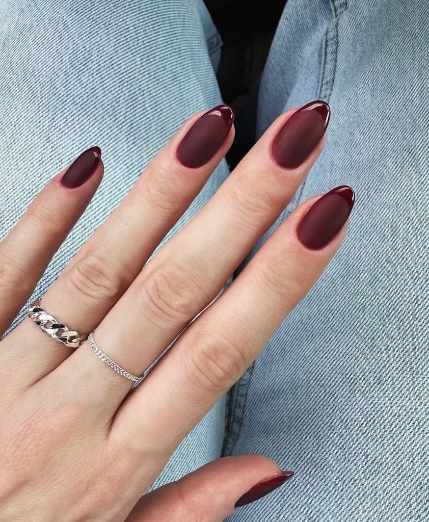 This set is simply incredible as it masterfully utilizes the texture— first off, you have a matte burgundy base and then a shiny tip for a dimensional look that’s both understated and trendy. The outcome is a very trendy concept of which one would not expect such wearability at all. It seems like a professional off-duty model and it has everything a well done short almond nail needs to have style feisty without include too complicated art or excessive sparkle. Worn with light denim with minimal jewelry,