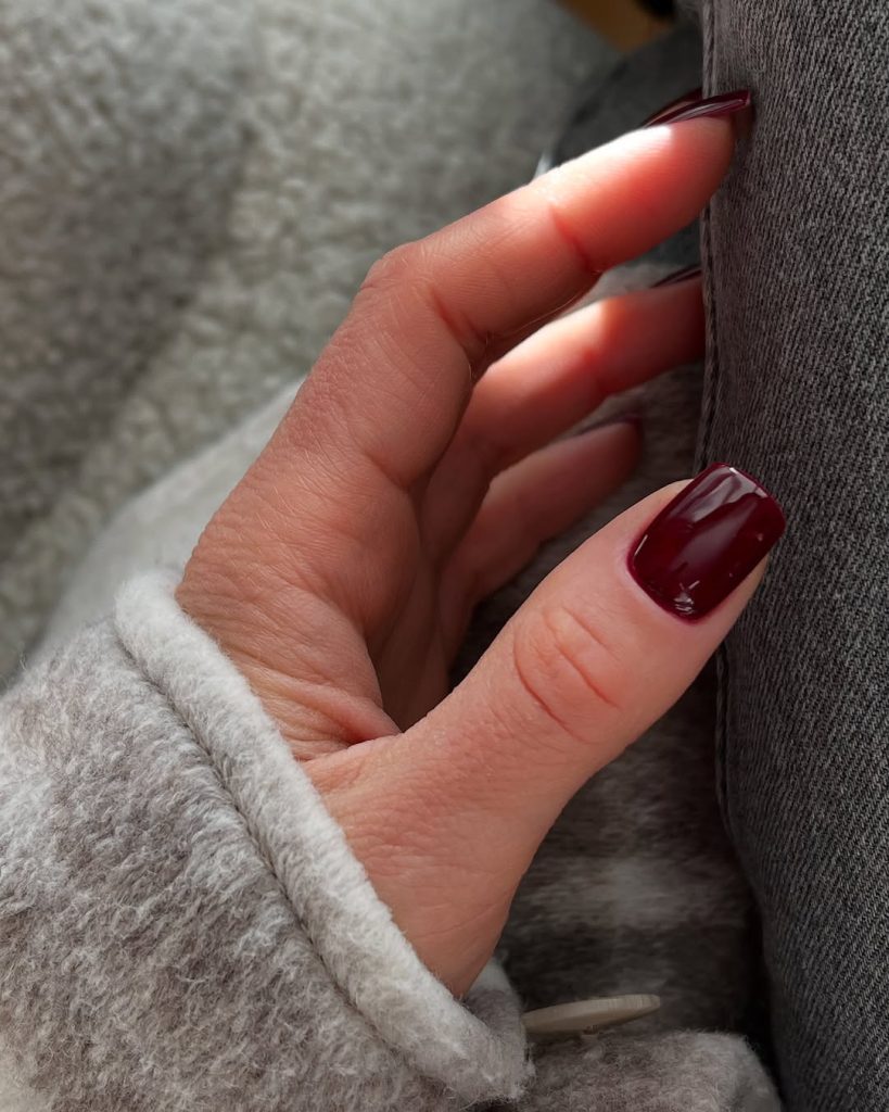 This square short and soft-edge manicure is a great way to get into that relaxed, sweater-weather style. The burgundy color is deep and warm, perfect for winter, and the glossy texture adds a little sparkle. Paired with a cream chunky knit, this design is overall very minimalistic, very versatile, and a great choice for women who prefer their nails to look natural but with a hint of luxury.