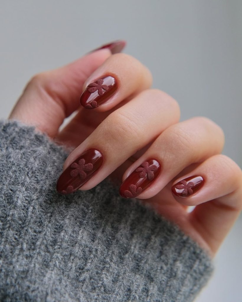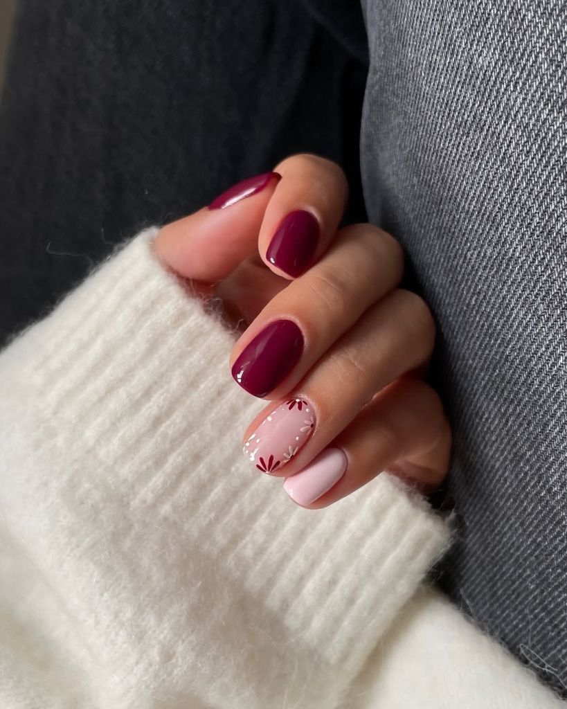 This short manicure is what you must have to turn the winter in your heart to the spring. Wear a solid burgundy polish and wear nails with the smallest floral designs that are delicate nude. Indeed, this set feels warm, lively, and absolutely pretty without any effort. The tiny leaves in light green and white dots make the flowers standalone without dominating the floral pattern. Such a design is a great choice for brunch dates, short trips, or simply for cheering up a cloudy week.