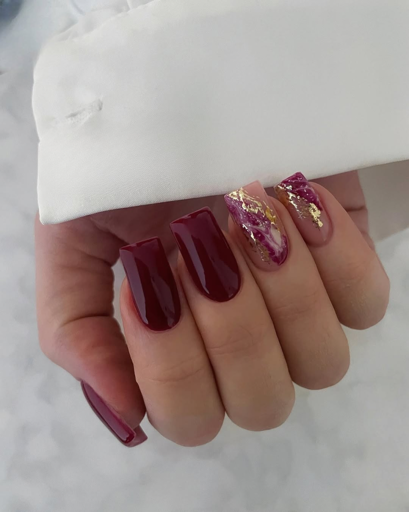 This eye-catching acrylic set has a background of predominantly deep burgundy polish on the most nails, with two extravagant accent nails demonstrating a marbled mix of burgundy, white, and clear, sprinkled with metallic gold. The interplay of shine, texture, and length radiates strong designer vibes. This is the type of long style that you wear to draw attention—it’s classy, trendy, and full of ideas for those who desire more than just a color.