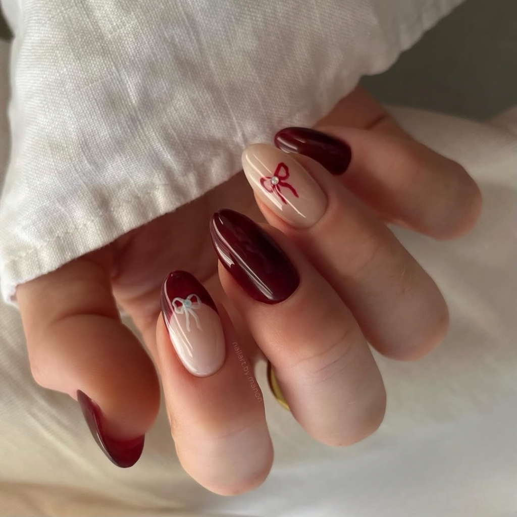 This almond-shaped set is both romantic and whimsical with the combination of burgundy and nude colors and the addition of dainty hand-drawn bow designs in white and red. The nails in this set are indeed narrative, they jump from solid color to fun nail art, thus, being ideal for the holidays, dates, or simply for spicing up your everyday look. This is a nail art idea that reflects your femininity, creativity, and also being completely trendy for those who want their nails to be a subtle mood representation.
