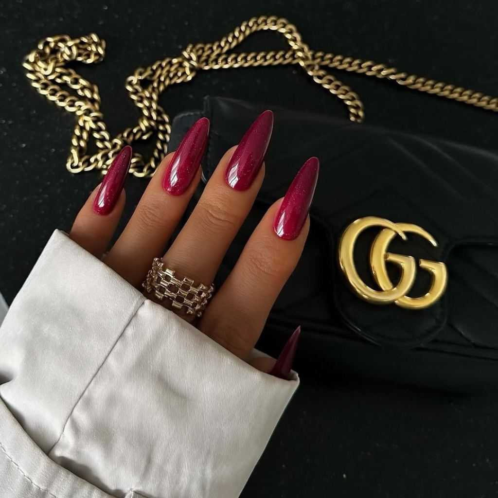 This suggestion is only for people who dare to be different – this long burgundy shade with a. It’s the pointed almond-cut nails that add a touch of the contemporary, while the tiny glitter particles trapped in the lacquer. The design is completed with a big gold ring and a handbag of an expensive brand, it is a composition filled with confidence and fashion. The look is perfect for night parties, night’s out, and on the days you want your nails to be like jewelry.