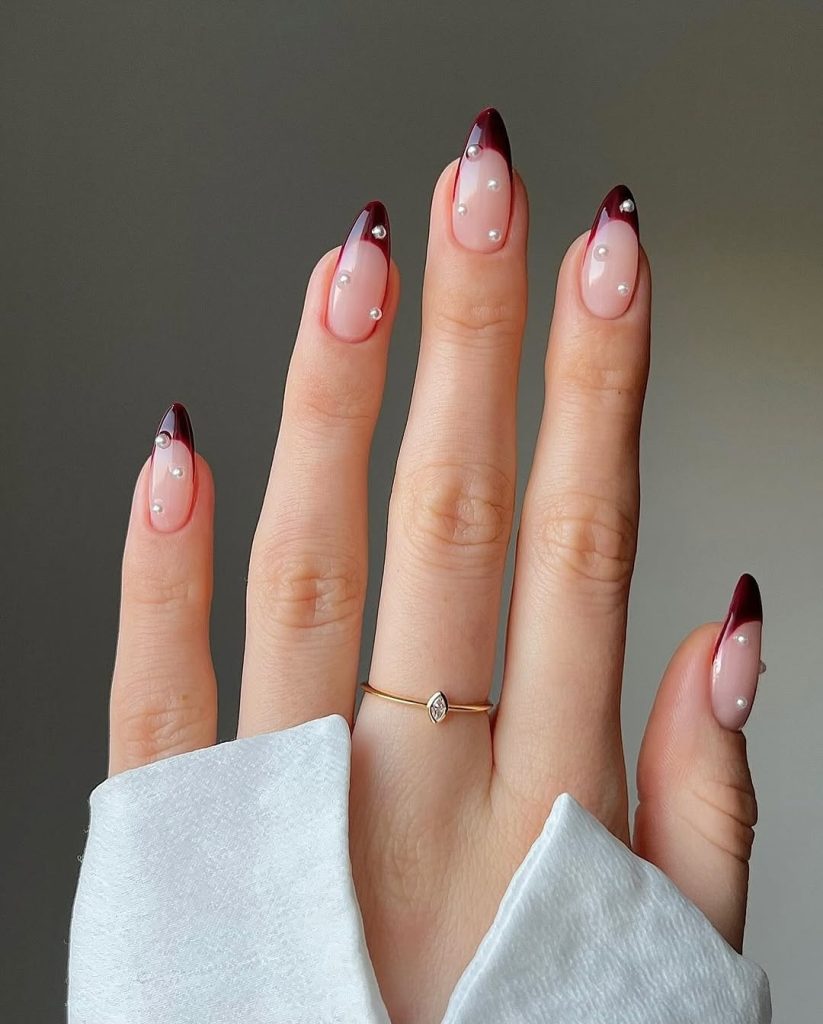 This French manicure has been given a luxury look thanks to the addition of pearl embellishments. The stylist uses a clear nude base and then sketches sharply defined dark burgundy tips and the addition of small pearl dots scattered across the nail plate. This design certainly has a romantic and regal vibe. The design is classy and fun at the same time, making it a fantastic choice for cute versus chic. With its enchanting interpretation of the classic French tips, this design is great for special celebrations or bridal events and will not be forgotten.