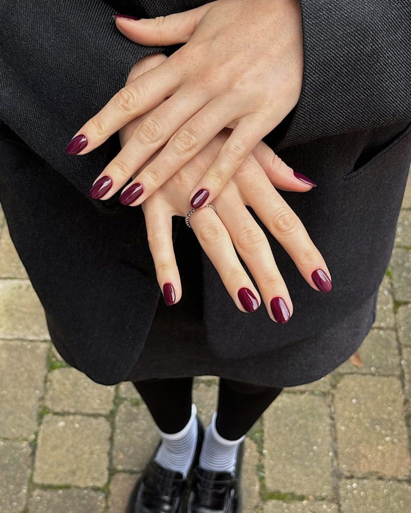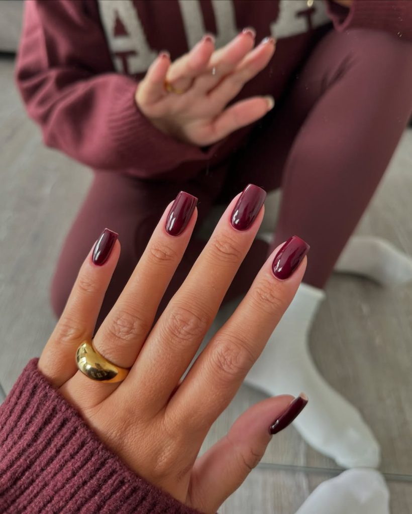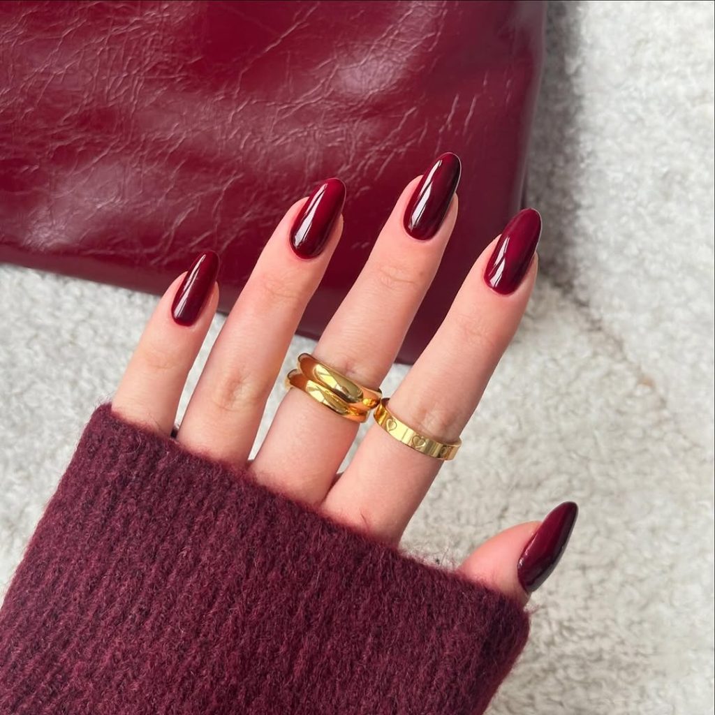 This square-shaped burgundy manicure is definitely luxurious with its high-gloss finish and hyper-feminine appearance. Each of my nails shines like an ornament made of glass, and the combination with filigree gold and rhinestone rings presents it as a true red carpet look. This kind of lacquer is perfect for attending elegant gatherings, Christmas feasts, or even being out with friends for brunch at a posh place. It is indeed one of those designs that look so easy yet so refined–the fact that dark nails can be both theatrical and profoundly chic shows it.