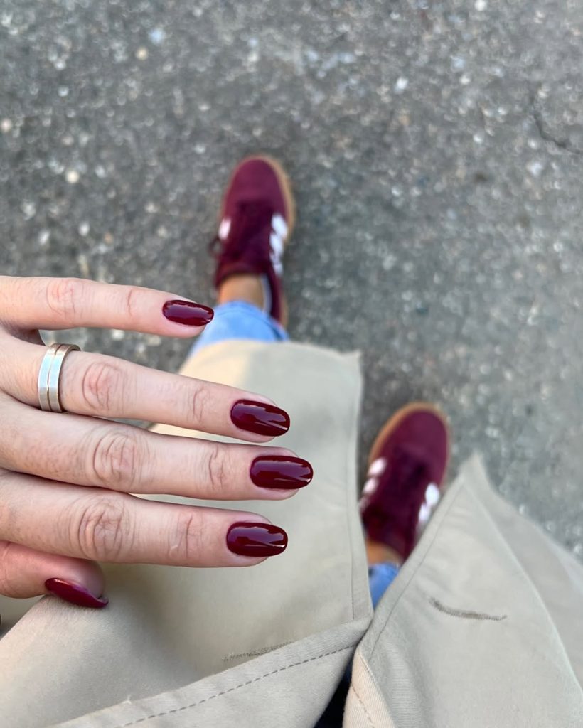 This basic but amazing burgundy set is entirely about the design of tones. The deep burgundy color, which looks like a glass of wine, goes marvelously together with the gold statement rings and a knitted textured long sleeve that brings along the coziness and the luxury aesthetic which in turn is the street fashion trend of winter. The almond shape further emphasizes the finger length, whereas the dark color reflects just a little of the light so that the nails appear as if they are integral parts of the outfit. This is definitely the must-have item for those women who truly appreciate a low-maintenance glamorous style.