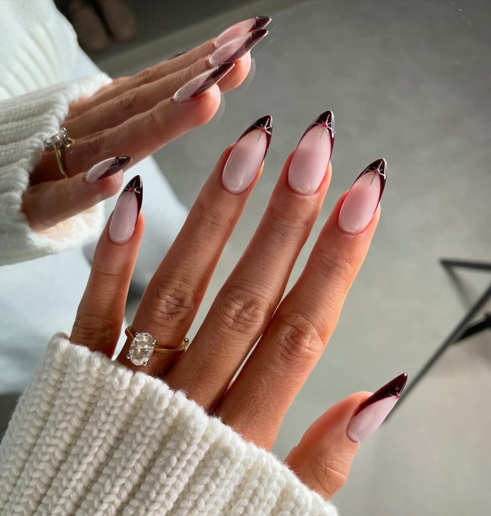 This lengthy almond-shaped manicure is a unique take on the classic French tips. It has a soft pink base color and pointed dark burgundy edges, which are decorated with a minimalist starburst detail. Although it is a delicate design, it is primarily graphic, thus it blends feminine softness with high-impact nail art. This is a perfect-choice for women who are always trendy and like to have fresh ideas that are beyond the regular styles but at the same time, they are still practical and look great.
