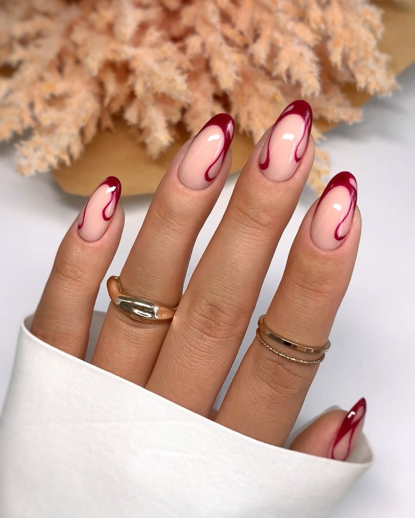 This design is exceptional if you are a lover of abstract and airy art forms. A beautiful nude mesh is the background for a liquid wave of touch in a bright red, depicting the most dynamic swirl. The reverse of bright red against a clear base is very noticeable, and the whole style becomes a perfect match for wearing in spring or summer. Minimal gold ring is the only accessory that completes the look. It is a perfect example of what editorial-ready nails should be like.