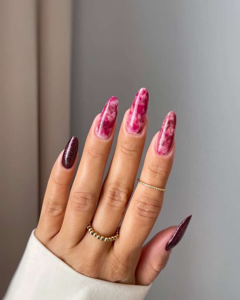 The long acrylic set for some extra fun lovers is the combination of bold glitter, marble texture, and deep pink colors. Three of the nails have chrome-like shimmers that are high-shine, while the other nails have a pink and burgundy marble design that is straight from the runway with a dreamy effect. This is a strong manifestation of a personal style—the ideal for someone who is not afraid to stand out and is definitely not shy about making their nail art a full-blown fashion statement.