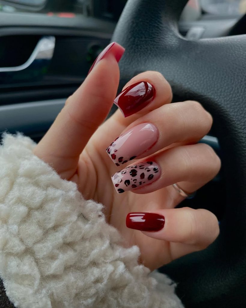 The square design represents the fusion of two strong contrasting designs, the classic burgundy polish and the trendy animal print. The nude base with leopard spots on two nails adds a playful twist, while the rest of the set stays grounded with deep red elegance. It can be seen as an excellent alternative for those who like a manicure that uses contrast and projects a totally chic and modern look.