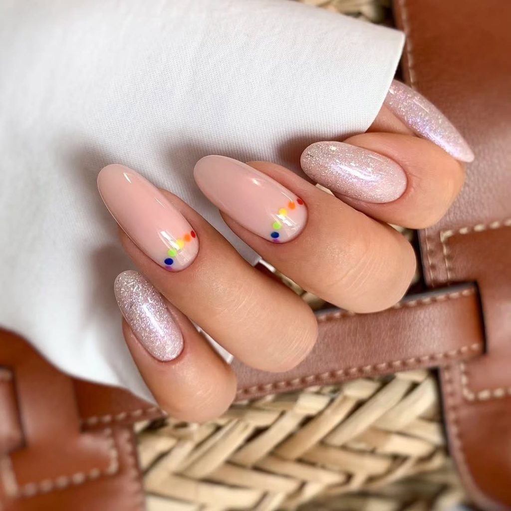 Sleek yet chic is the way to describe this gel nails that is a modern take on the classic nude nails. It is made of soft pink base is adorned with sparkling accents and a fun pop of color. Just a few minimalist rainbow dots near the cuticle give it a very light touch of personality, which is also a perfect choice for a colorful trip. Be it a dance floor at a beach party or a hike on a tropical island, the adorable and different design will make your nails stand out for sure.