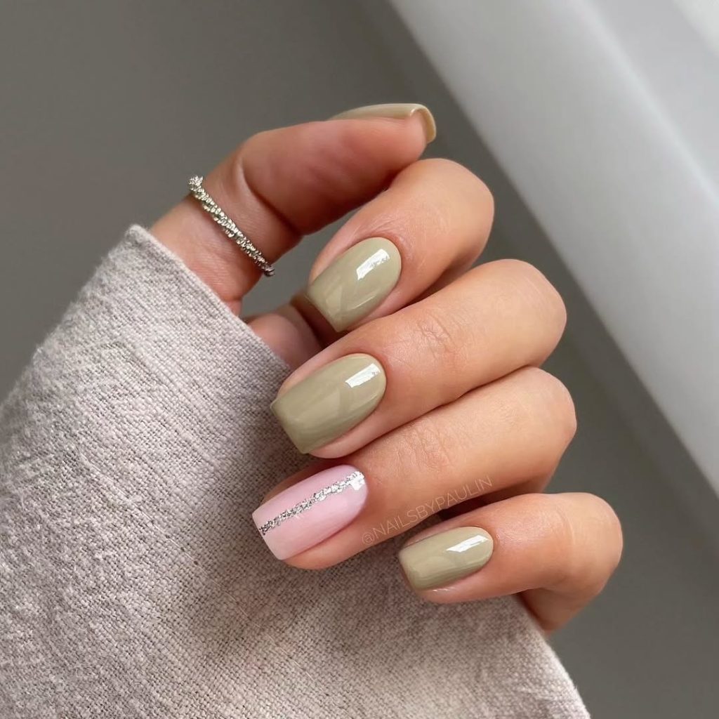 For a modern yet sophisticated look, this square manicure in earthy green tones is a stunning choice. The contrast between the muted olive shade and the delicate French accent on one nail creates a fresh and polished effect. This is a perfect vacation nail style for those who love neutral tones but want a little something extra. It pairs well with linen outfits and woven accessories, making it a stylish companion for exploring city streets or enjoying nature-inspired retreats.
