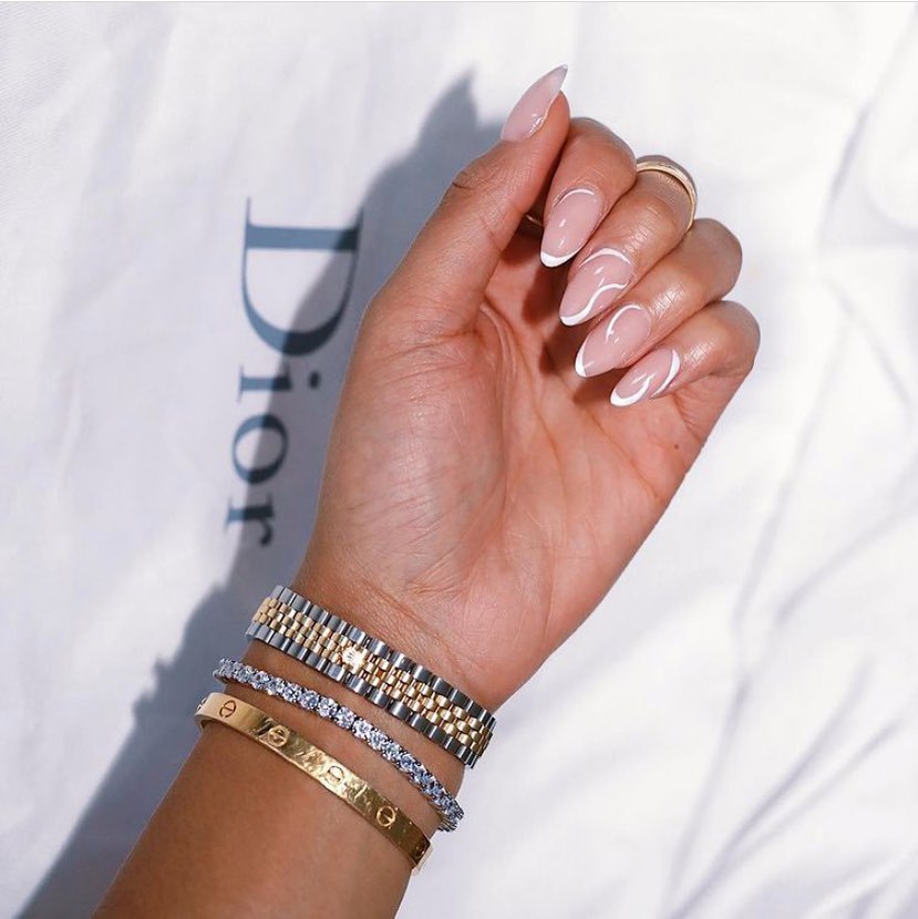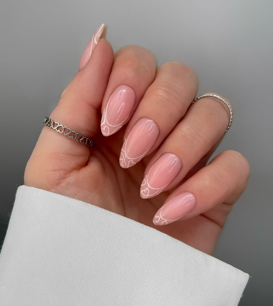 Incorporating a playful and romantic element into the classic almond-shaped French manicure is the white heart shapes that outline the tips. The soft pink substrate dominates with the sophisticated look, while the detailed elements give the design a playful feeling. This lovely shape is ideal for escaping to romantic beaches, or any other travels where you like to give an additive of love to your look. The gel gloss finish, besides giving beauty to the design, turns it into a trendy and charming pick for any event.