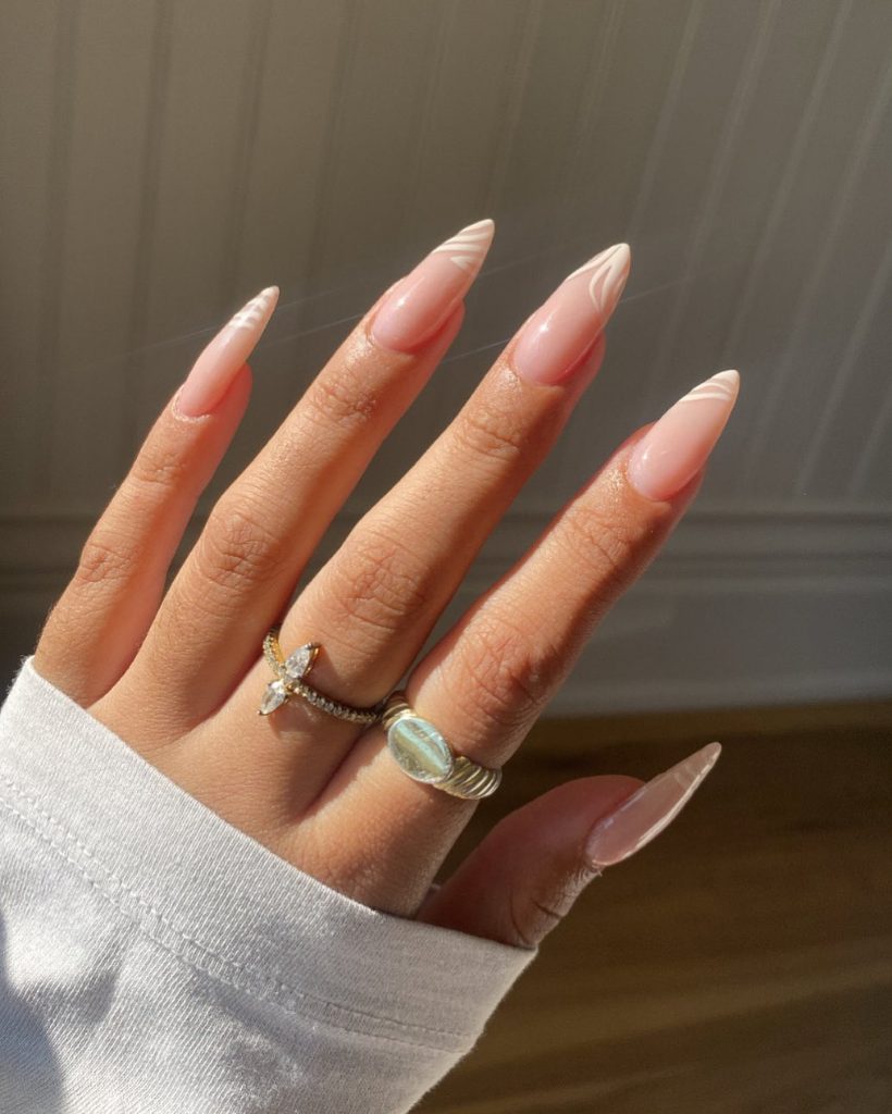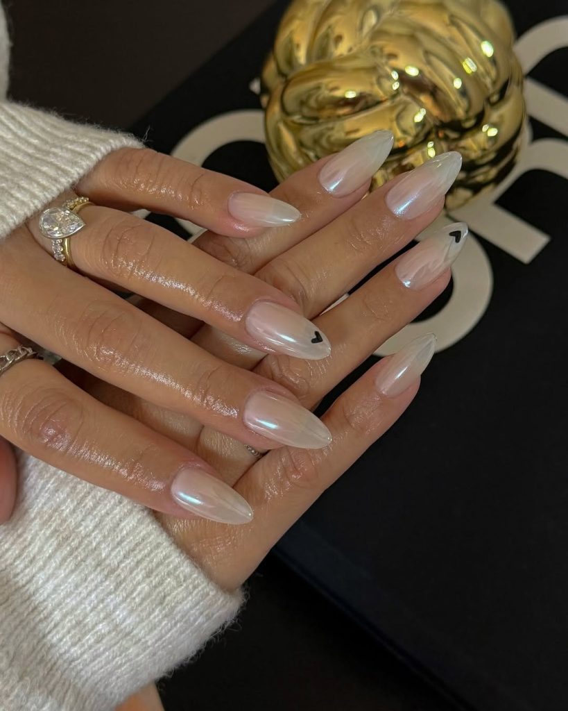 This almond-shaped long manicure is a modern take on the French style and is done with white chrome that introduces a reflective, modern, and shiny look. The base gradient of transparency makes the natural appearance of nails possible while the curved, mirrored design gets a chance to show off its beauty. For those who are trendy and yet classic, it is a perfect combo of wearing it with minimalist jewelry and a simple holiday outfit.