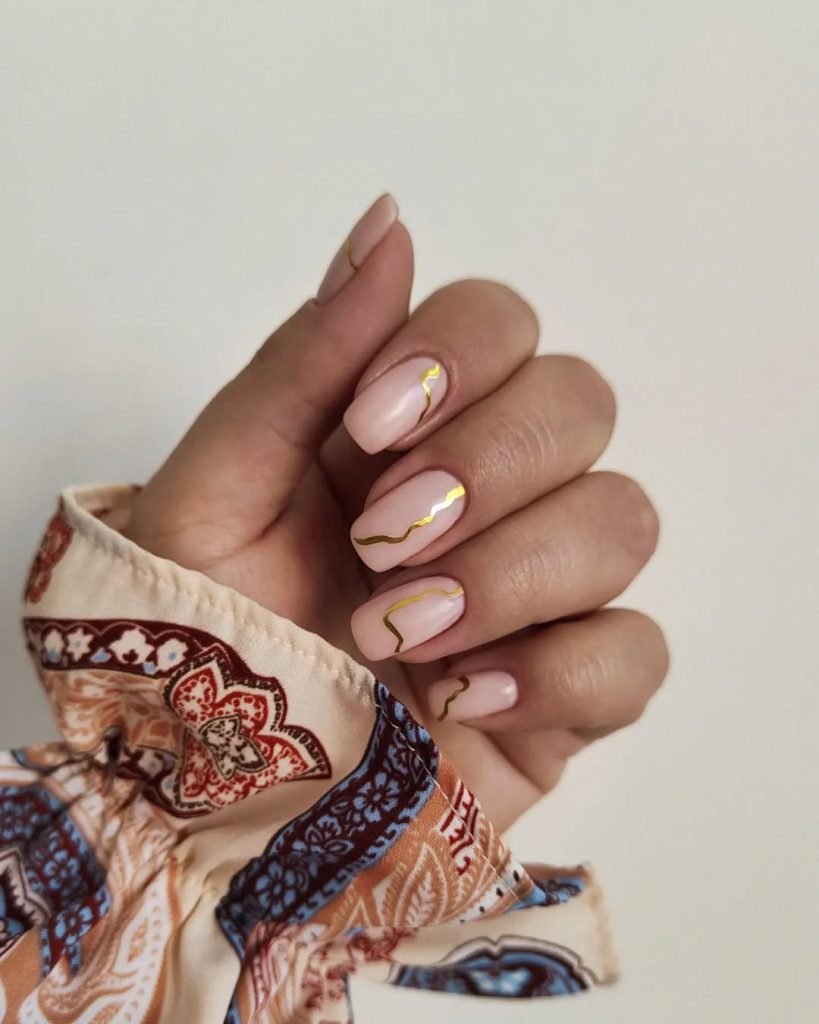 For those who love a hint of opulence, this short square manicure features a soft pink base adorned with thin, artistic gold lines. The irregular metallic detailing adds a contemporary edge while keeping the look elegant and subtle. Whether you’re enjoying a luxurious resort or a cultural city tour, this manicure pairs beautifully with boho-chic vacation outfits, effortlessly enhancing your overall style with a cute yet refined touch.