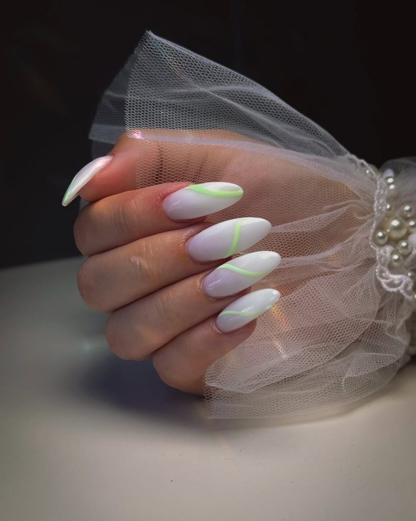 The standout feature of this manicure is the almond shape blending white chrome with eye-catching neon green swirls. The collaboration of the soft, elegant side and the modern, bold side makes it so attractive that it is definitely for those who love vibrant yet traditional vacation nails. No matter if you’re grooving at a beach party or walking around a colorful summer festival, this design will definitely give you a fun yet sophisticated vibe. Using a combination of highly glossy gel and ultra-precise line work, this design gives a trendy and stylish finish.