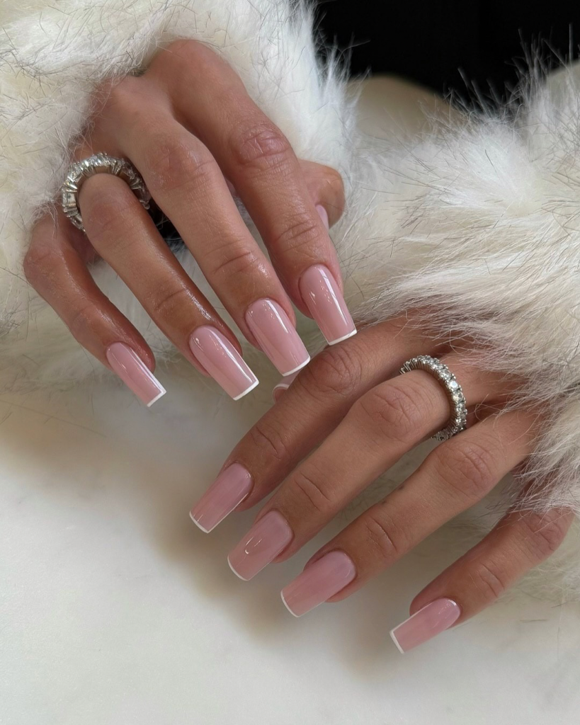This short square design with a soft pink base and shiny glitter tips is a sophisticated take on the classic French manicure. The slight chrome shiny factor is a small but valuable luxury making it a top choice for a relaxed chic vacation. This look, which is both simple and cute, gives out a very high-end, modern feel wherever you are; whether walking through cobbled-street towns in Europe or having a view of the sun setting in the tropical islands.