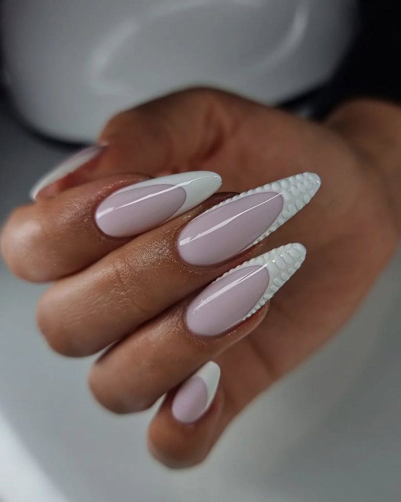 This almond-shaped manicure newly perceives the ombre trend, the fade of color looks very beautiful and the whole thing is just very original for me. Leaves the nail bed with a natural nude color and adds a very luxurious white chrome tip that glows definitely in this design. The idea of a two-tone design makes this model an absolute necessity for the stylish traveler. No matter if you are having a spa treatment or wandering through the old city streets, these nails will make your hands keep looking polished and luxurious.