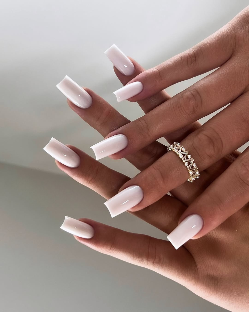 This chic and square short manicure is an example of the soft classic style, made up of a white pearlescent finish that catches the light beautifully. The muted glossy surface offers an aura of delicacy and dreaminess, which makes it the choice of the day for a refined vacation look. You may wear it to a resort brunch or an evening yacht party; this gel manicure would still bring a polished but unpretentious feeling, which suits both casual and formal wear so well.