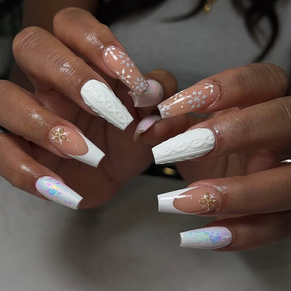 This acrylic winter dress is particularly flattering to ladies who like longer square cuts. The white contrasts with nude very well and, the art of snowflakes makes it quite amusing. It is an ideal compromise of concepts that are easy and challenging to the season.