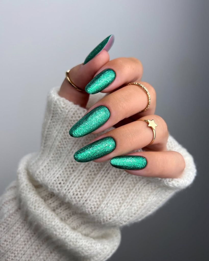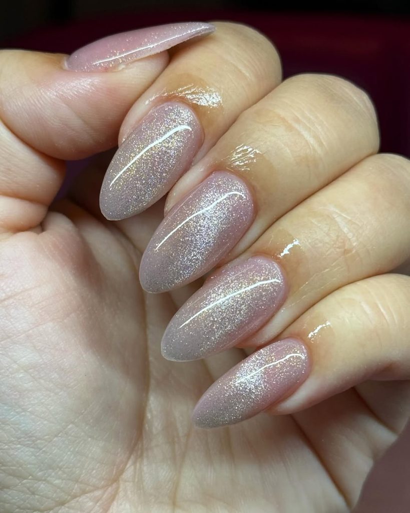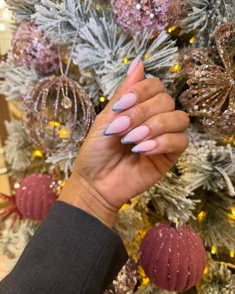 It is a low-profile, but classy almond-shaped appearance that fits well in women seeking inspirations. Due to the fact that the glitter is light, the growth lines are not prominent and thus this design is simple to keep up during the season. The best alternative to choose in December 2025 when you want simple and stylish ideas.
