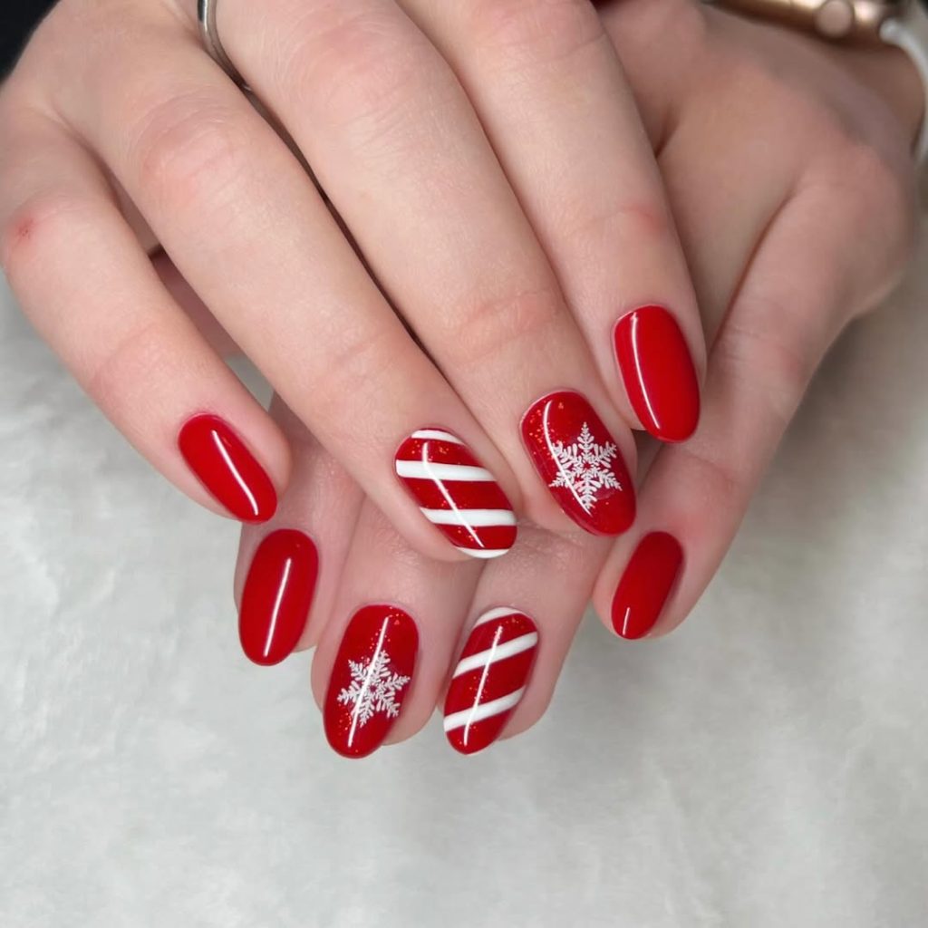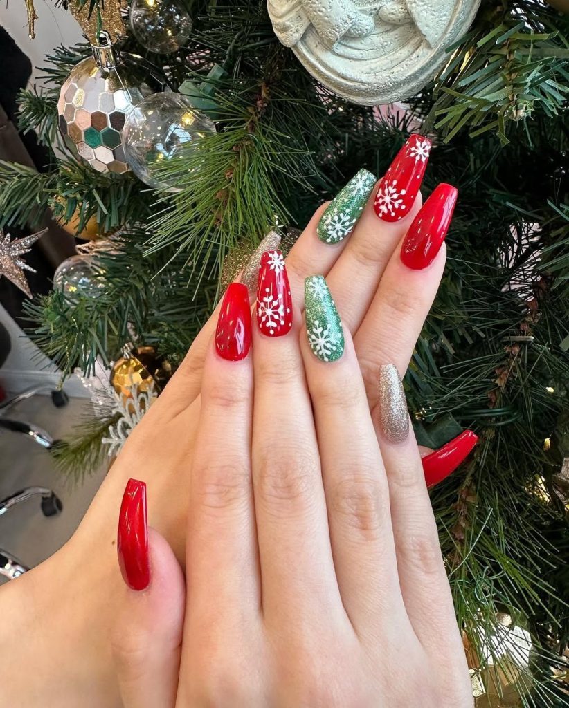 25. Red and Green Snowflake Nails