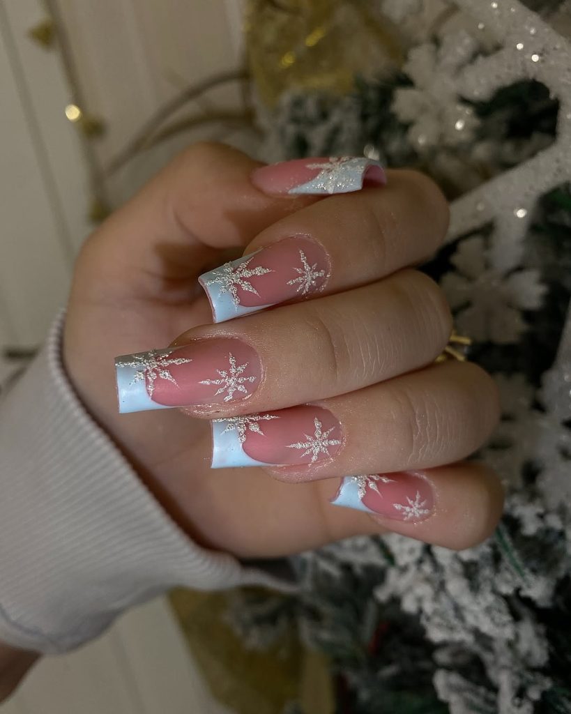 This design is ideal with square acrylic shapes and it looks great when you want a bit of shimmer in your nails but still feel simple. The light blue shade is warm and matches well with cozy sweaters and is beautiful on Christmas xmas parties, and even daily winter outings.
