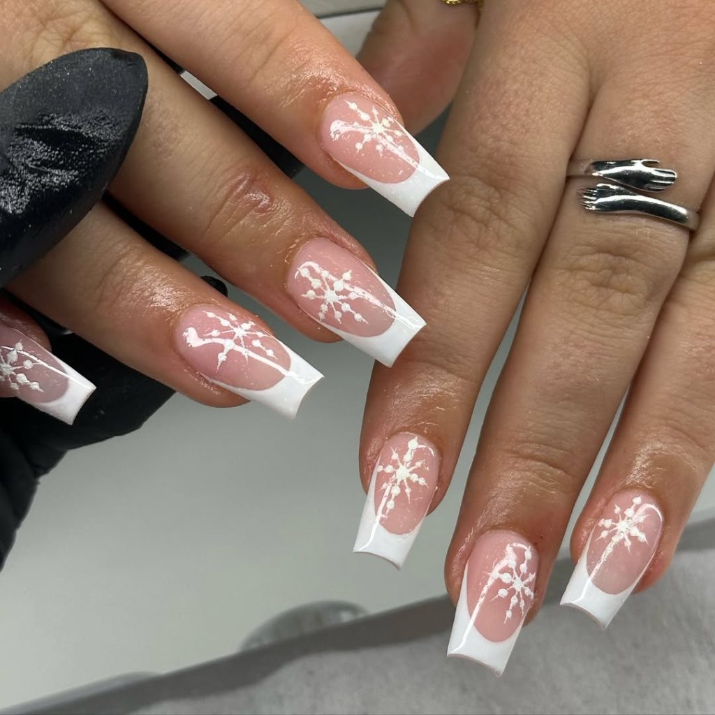 7. White French Tips with Snowflakes