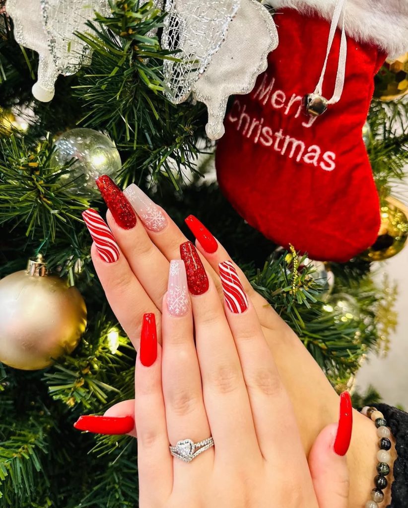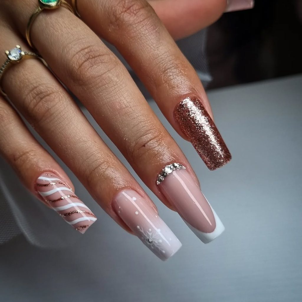 These nails are a prettiest way to add some glamour this December when you are feeling like it. Blends of rose gold glitter, candy-cane stripes, and light snowflakes have each nail looking like miniature holiday art. They are not too daring, but not dominating and your manicure becomes the hero of the season.