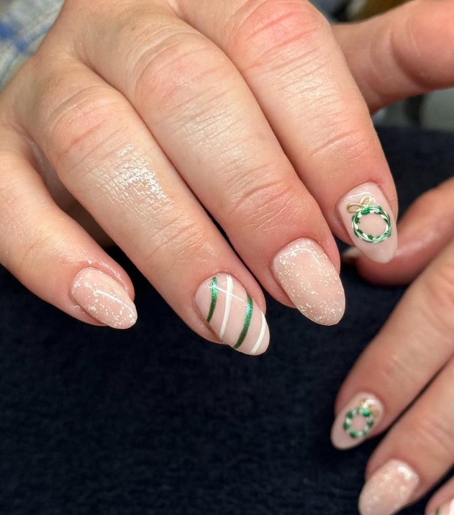 Bon appetit on shorter almond forms, this collection is ideal when a woman needs fuss-free designs but in detail. The nude base is soft and makes its ideas simple and the green wreaths put a fun pop of color. They work perfectly as December nails ideas that are both daily wearables and holiday festive.