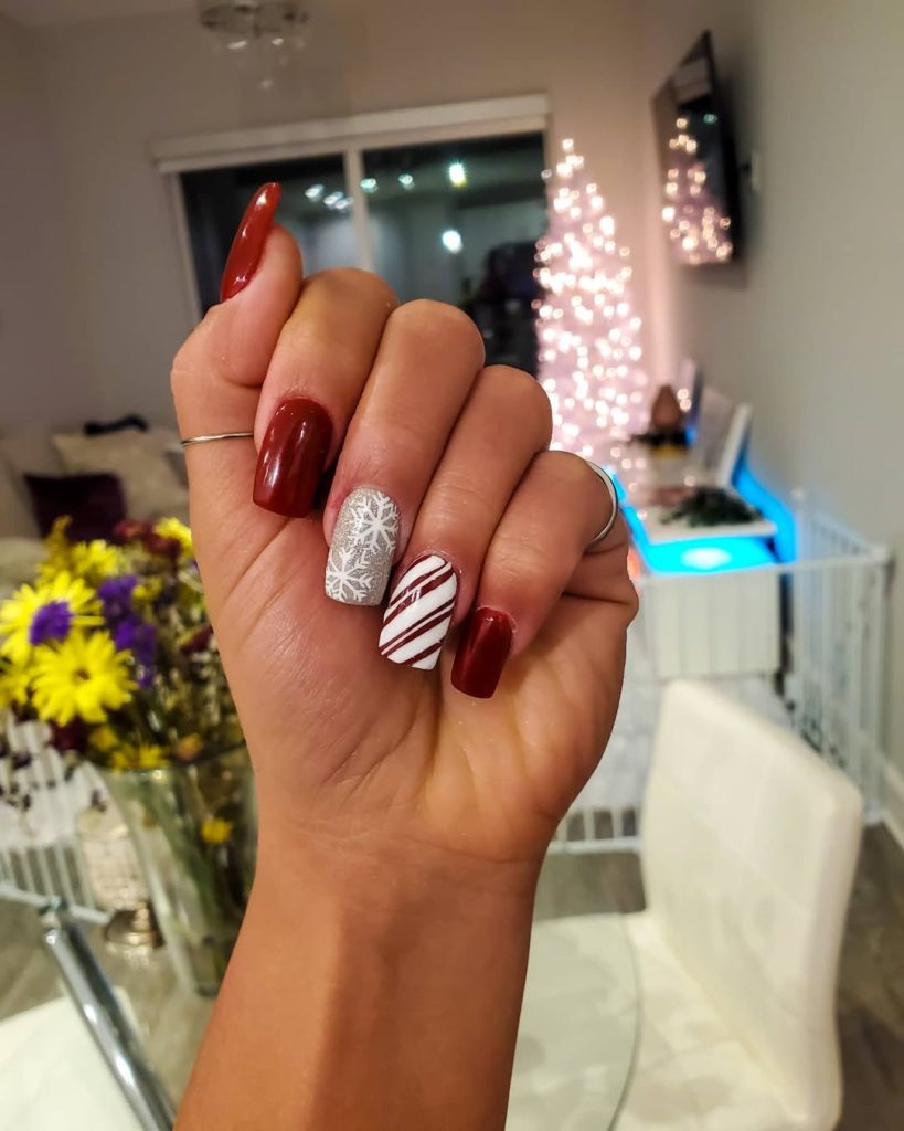 12. Deep Red and Candy Cane Accent Nails