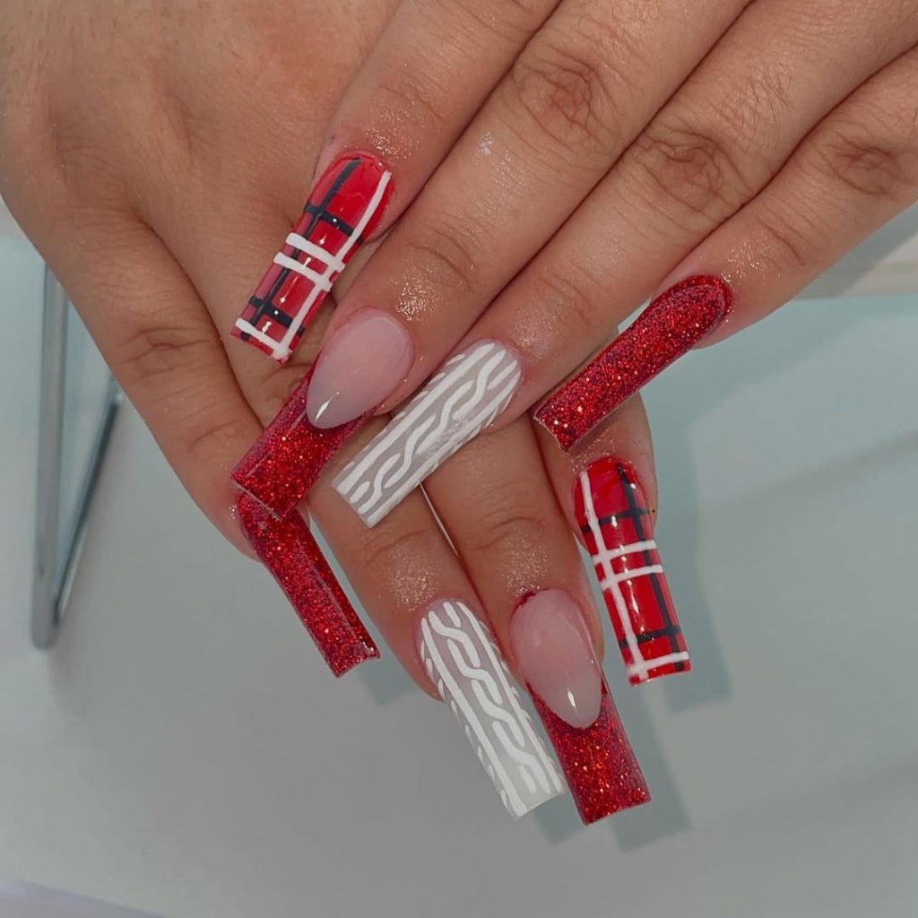 Unconventional and catchy these nails blends red glitter, plaid, and warm sweater-themed artworks. They are cheerful, joyful, and unashamedly Christmas the type of nail decorations in December that make you smile whenever you look at them. The nails are a sort of miniature vacation attire.