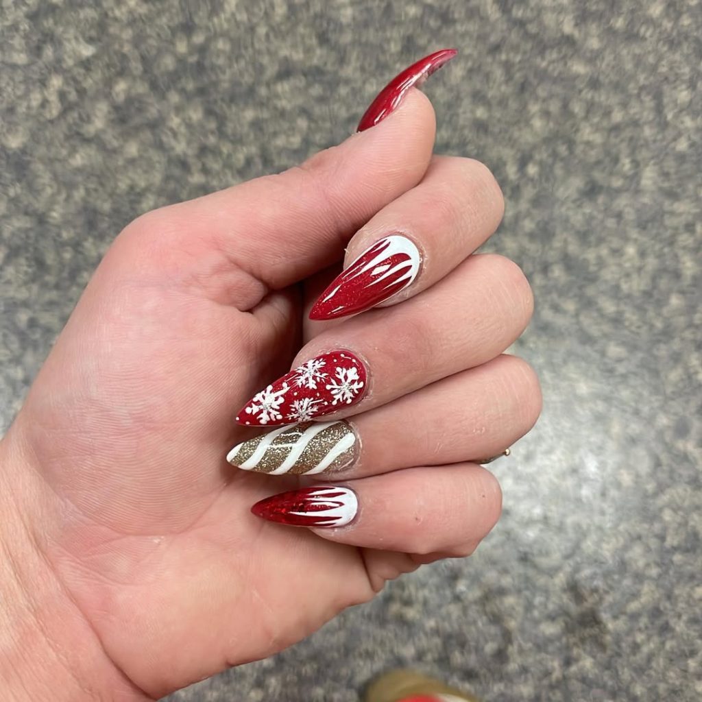 Their dripping red glitter, dripping snowflake accents and candy-inspired stripes make these nails dramatic and fun. They are like a holiday party right on the tip of your fingers, merriment, naughty, and spirited. Ideal ladies who would love December nails that can make head turns and stir up conversations.