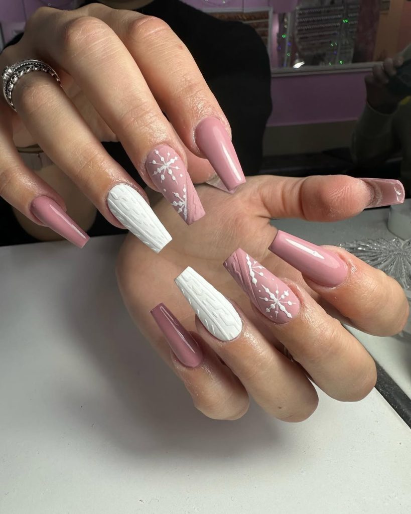 17. Pink Sweater Nails with Snowflakes
