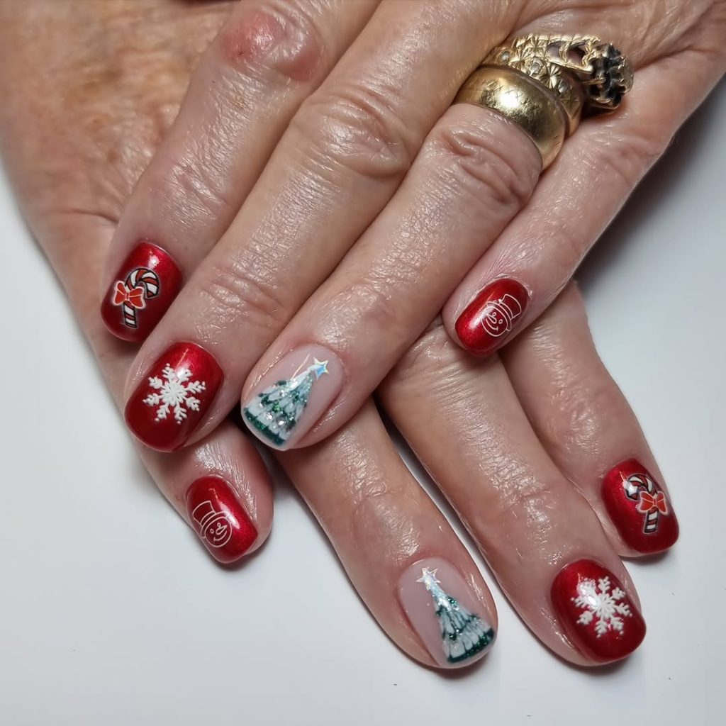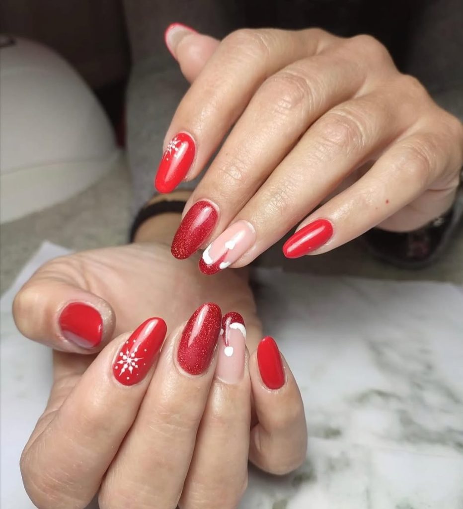 Red and green are one of the few color combinations that reflect the Christmas holiday atmosphere and such nails make it come to life so beautifully. They have snowflake accents and a hint of glitter, which makes them feel essential, magical and playful at the same time. They are the type of designs that make you immediately feel like its Christmas.