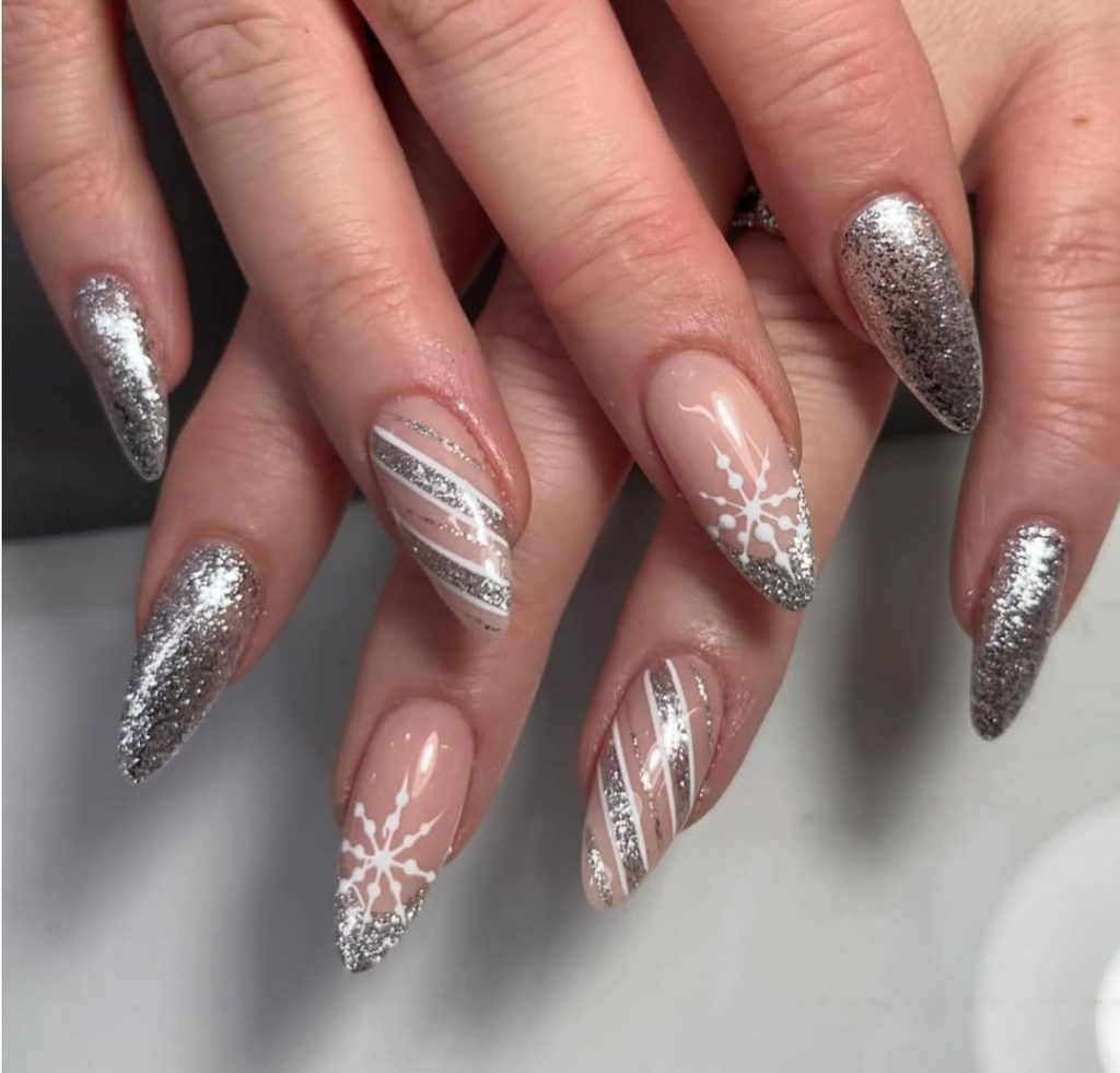 23. Silver Glitter Snowflake Nails