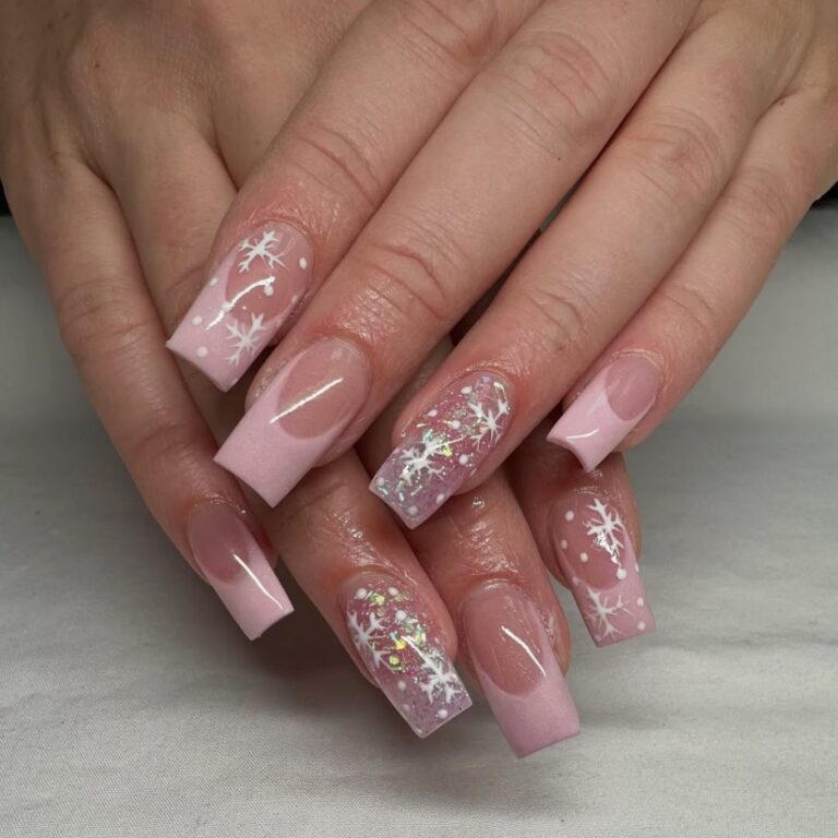 A French manicure is timeless and this is a twist that leaves it brand new in December. The sharp white ends are added with the elegant snowflake art making it elegant and seasonal. These nails are classy enough to wear at formal dinner and merry at Christmas 2025 events.