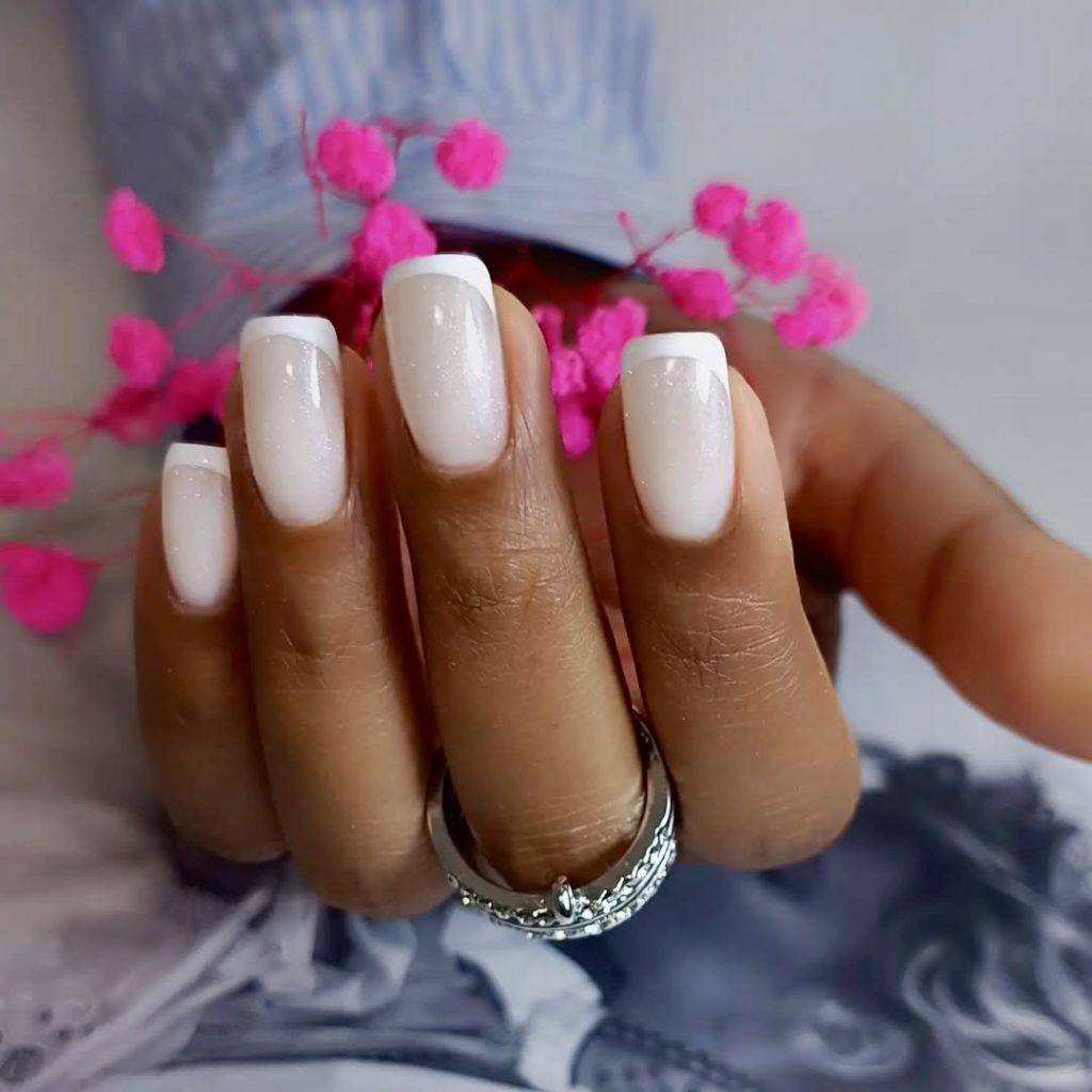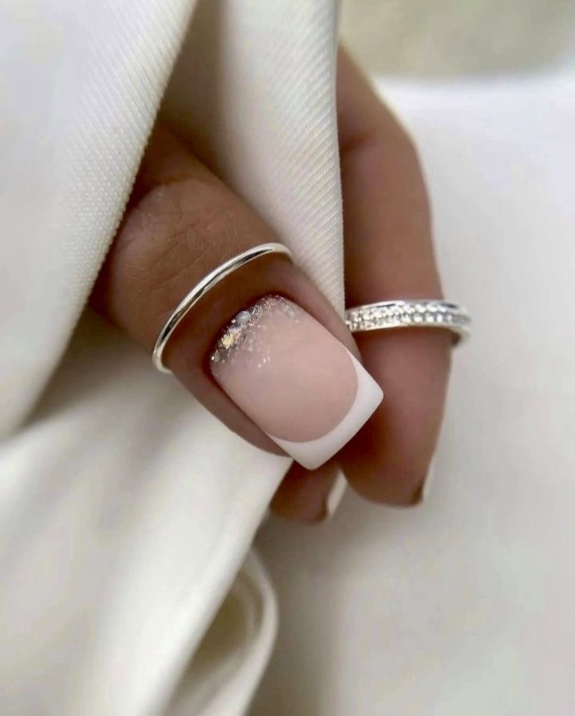 This short square nail is strips of dreamy minimalism with a sparkle. The white French tip gradually dissolves into a sheer nude base, finished off with the perfect touch of glittery shimmer, which reflects the light. It is one of those designs that don’t shout for the attention, but wins it with class. This style is absolutely stunning for brides, baby showers, or if you’re embracing your ethereal self. As for styling, think about light fabrics, pearl earrings, soft waves – pure timeless charm.
