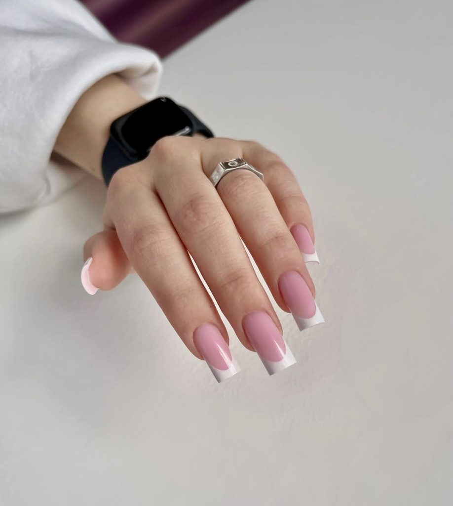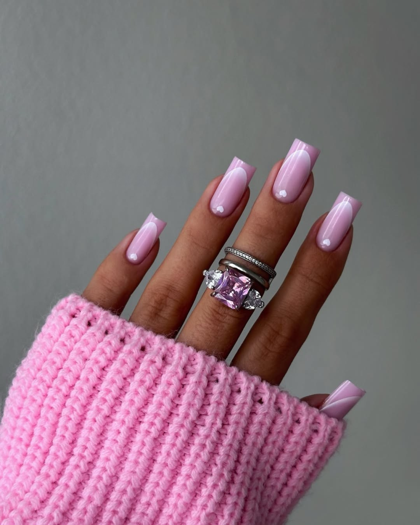 A contemporary fashion for a monochrome is the one that concludes this trend lineup. This pink French tip design comes comprising of a creamy rose base and matching tips with a high-gloss finish that is softly enhanced by mini-pearl heart accents. The result is sleek, delicate, and a little dreamy. The box shape adds a balance to such a hyper-feminine shade, fitting both comfy knitwear or date-night slip dress. This is a soft power move—feminine without apology.