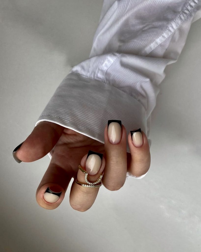 French tips do not all have to be white. This contemporary twist has a deep black shade to add emphasis to the edge of short square tips, combined with a creamy beige base. The contrast is dramatic but not too much – it gives a rather bold black and white while still maintaining minimal and architectural aesthetics. The look is perfect for those women who have their distinct personal style, and it suits structured blazers, gold jewelry, and designer handbags. It is fashion-editor approved and is perfect for those who are wanting to bring high-end runway looks into their everyday beauty routine.