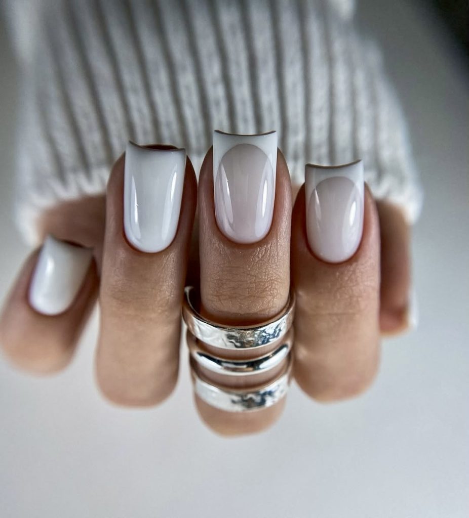 This style is a minimalist’s dream. The mini square shape, in combination with ultra-clean white tops and a see through beige base, is effortlessly polished. It is perfect for those who appreciate a clean line and “less is more” look. Such nails are a perfect idea for autumn wardrobes and go well with any trench-coat, beige knitwear as well as tailored slacks. Manicure doesn’t scream for attention but earns it quietly – there is something self-assured about such manicure. Think “old money” manicure with a modern 2025 sensibility.
