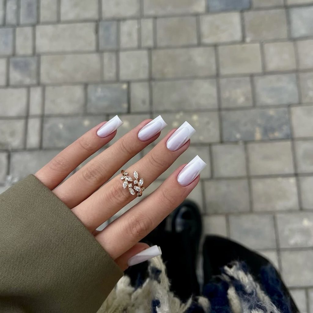 Fitting a grand finish of pure sophistication, this long square manicure has a dreamy white ombre that bleeds into a sheer base. That’s the end result of ultra-luxury for formal affairs or simply spicing your normal every day style up. There is a dreamy quality to this collection as if one is looking into nail-sized soft-focus lighting. Combined with a fancy gold ring and layered external clothing, this style represents the contemporary goddess sojourn-classy, sophisticated, and straightforwardly stylish.