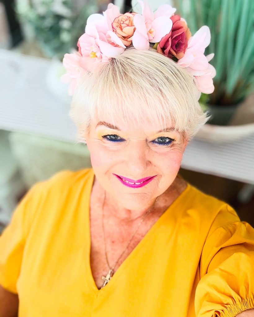 The charming soft blonde pixie cut of this one is highlighted by the whimsical colorful bouquet headdress. The blown hair is arranged so elegantly to provide a balance to the joyful and bright outfit. Such a type of pixie is an easy and elegant option for the ones who like to use funny accessories in their dress with a minimum time of styling.