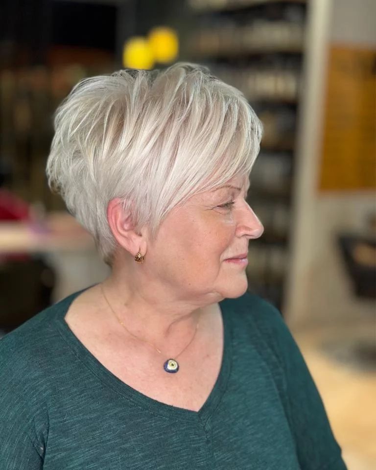 This trendy hairstyle is short pixie and has a layer of soft hair to bring out the sophistication and elegance of it. The gray color combined with platinum tones makes pink an eye-catching and youthful color. This kind of hairdo is great for those who have thick hair because it will add natural volume to their hair but will keep it looking lightweight and effortless. It is a perfect choice for those who cherish and adore a clean and chic look because it requires minimal styling.