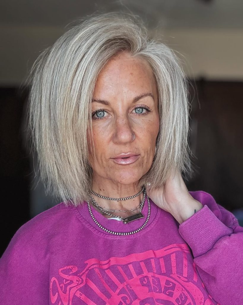 An instant volume and texture addition to the short bob is the wavy bob making this the best style grey hair. The soft waves move the hair while keeping it in a structured shape that is ideal for fine hair to look thicker.