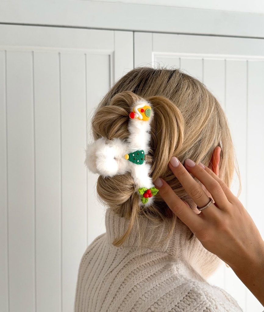 Quirky, such as Christmas clips, are the most notable features of this festive updo that thus brings a cheerful twist to a simple bun. This hairstyle, ideal for medium-length or short hair, is perfect for Christmas parties and family gatherings. With the playful details, the hairstyle gives a little bit more joy and creativity to them, and it is just great to the cozy holiday outfits.